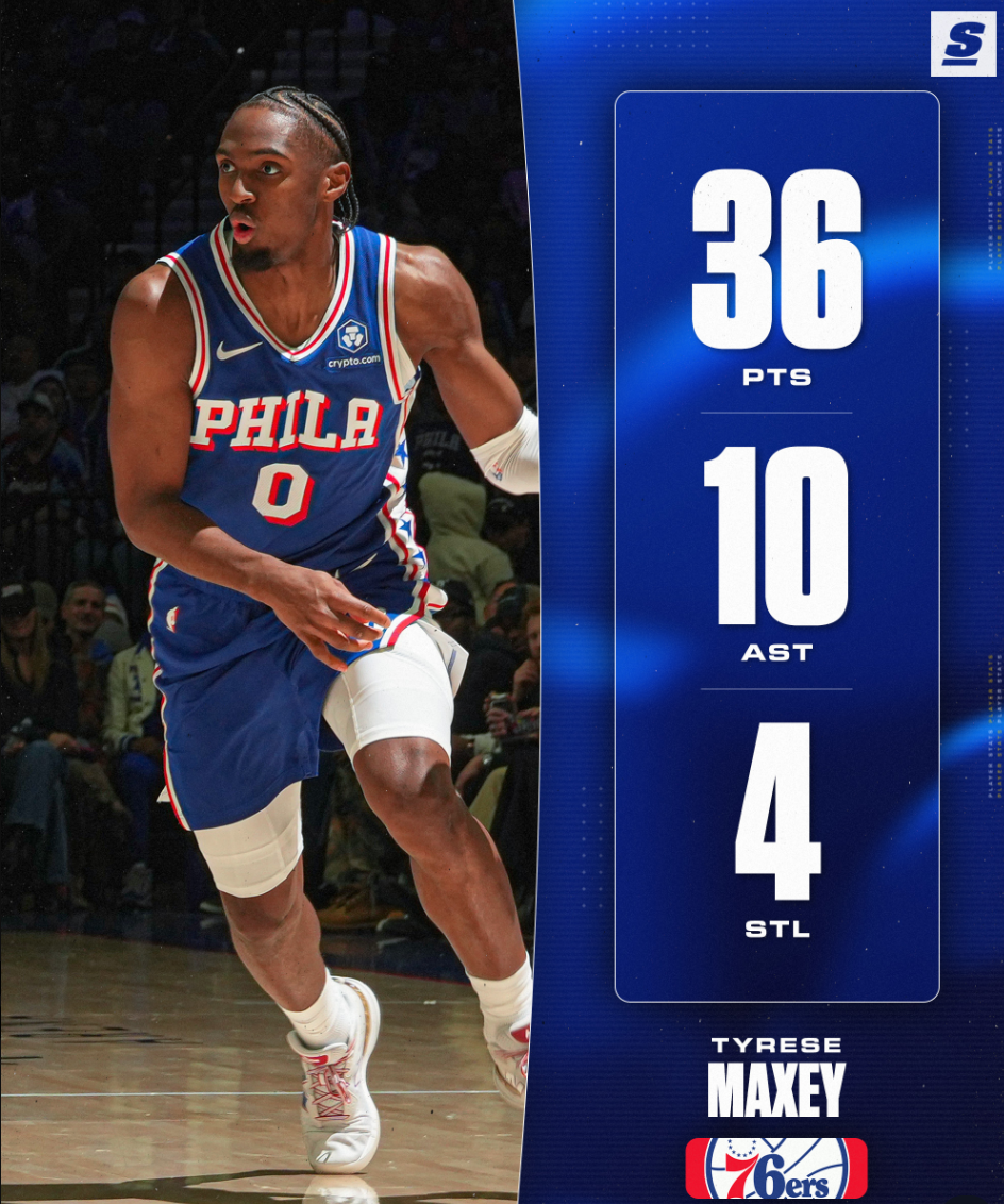 恩比德鏖战45分36秒赛季新高,拿到32分15篮板10助攻1抢断1盖帽5失误,命中率52.6%,三分命中率33.3%,罚球12中11。