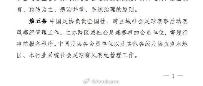 此前,中国足协正式印发《中国足球协会社会足球赛事活动赛风赛纪管理办法(试行)》,其中强调“主办跨区域社会足球赛事的会员单位,需履行事前报备程序”。