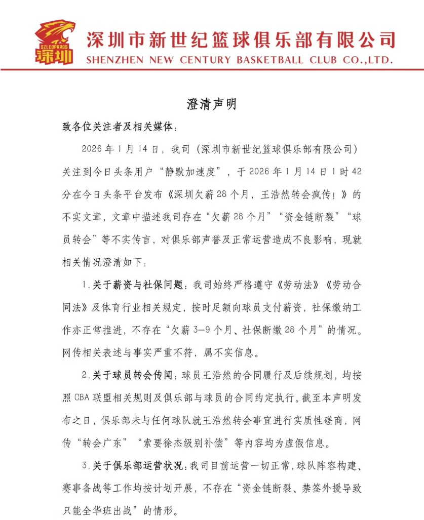 1月14日,深圳男篮更新官方账号,回击了不良自媒体关于俱乐部“欠薪”和“球员转会”等谣言。